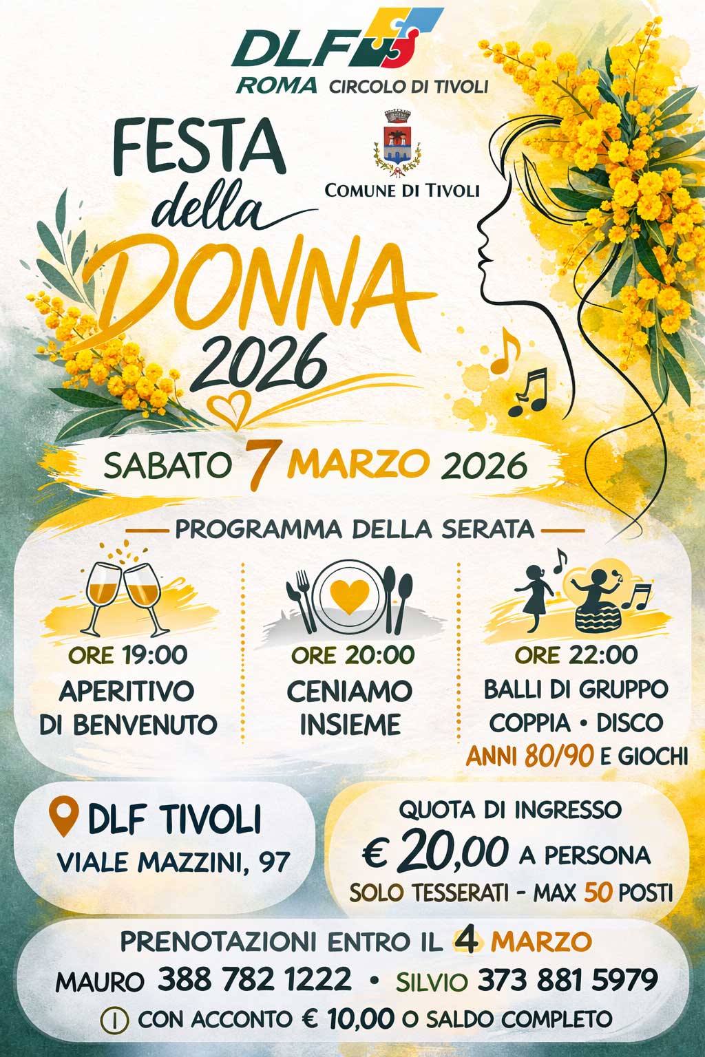 Il DLF Roma – Circolo di Tivoli, con il patrocinio del Comune di Tivoli, vi invita a trascorrere una serata all’insegna dell’allegria, della convivialità e del divertimento per celebrare insieme la Festa della Donna.